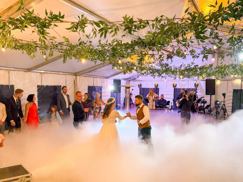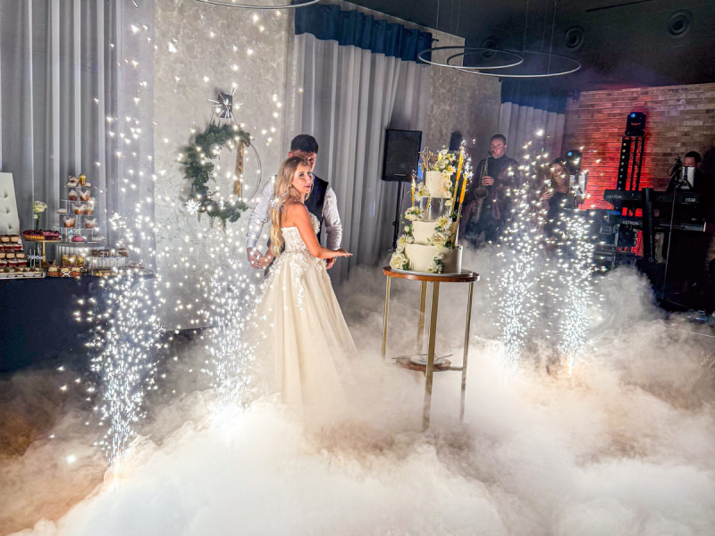 - ciężki dym - idealny na pierwszy taniec, wejście Pary Młodej lub efektowną oprawę tortu. Tworzy bajkowy klimat unoszących się chmur nad parkietem,