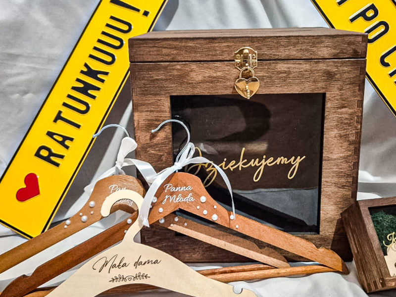 - dodatki i detale eventowe - tablice powitalne, pudełka na koperty, pudełka na obrączki, wieszaki i inne elementy, które dopełniają całość i tworzą spójną, estetyczną oprawę.