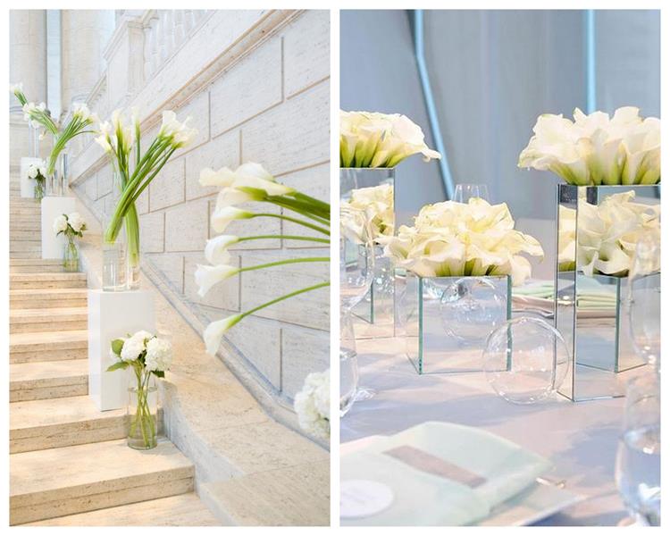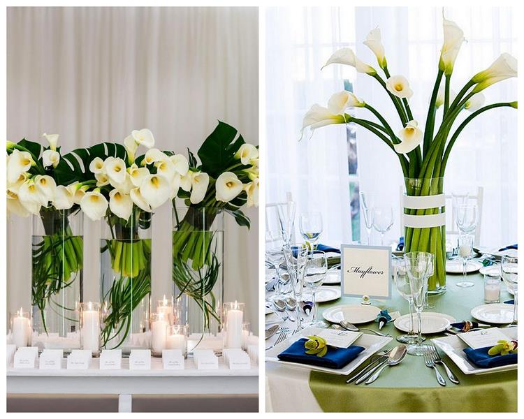 Z cantedeskii zrobić można zarówno długą, wiszącą wiązankę, jak i maleńki poręczny bukiet. Kwiat ten (oczywiście w tym samym kolorze, co ślubna wiązanka) oryginalnie wygląda również w butonierce Pana Młodego. Ale kwiaty cantedeskii znajdują zastosowanie także w dekoracji kościoła i sali weselnej. Zaletą jest tu właśnie ich trwałość. Wykonane nawet kilka dni wcześniej dekoracje z użyciem kwiatów, w dniu przyjęcia nie będą wyglądały nieświeżo. Kalie spotkamy więc tradycyjnie w wazonach na stołach, w szklanych, wypełnionych wodą naczyniach, na końcówkach stołów i przy oparciach krzeseł.