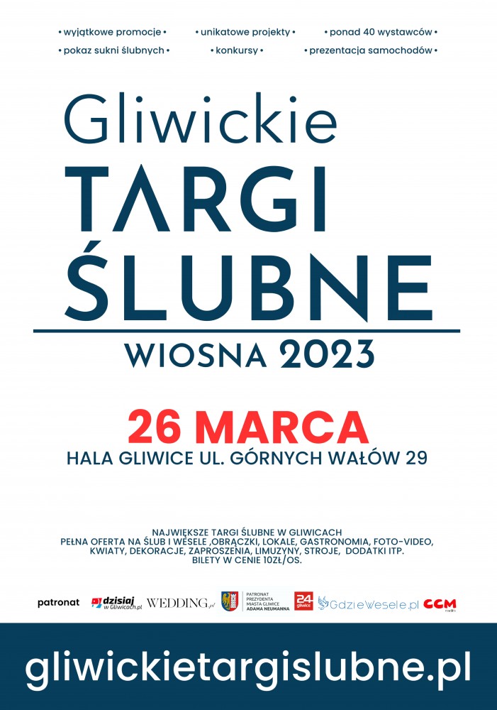 26 marca 2023 roku w hali widowiskowo-sportowej przy ulicy Górnych Wałów 29 w Gliwicach odbędzie się pierwsza edycja Gliwickich Targów Ślubnych. To największa impreza tego typu w samym centrum Gliwic dedykowana branży ślubnej. Doskonałe miejsce do poznania ślubnych nowości oraz trendów, stworzone specjalnie z myślą o przyszłej młodej parze.