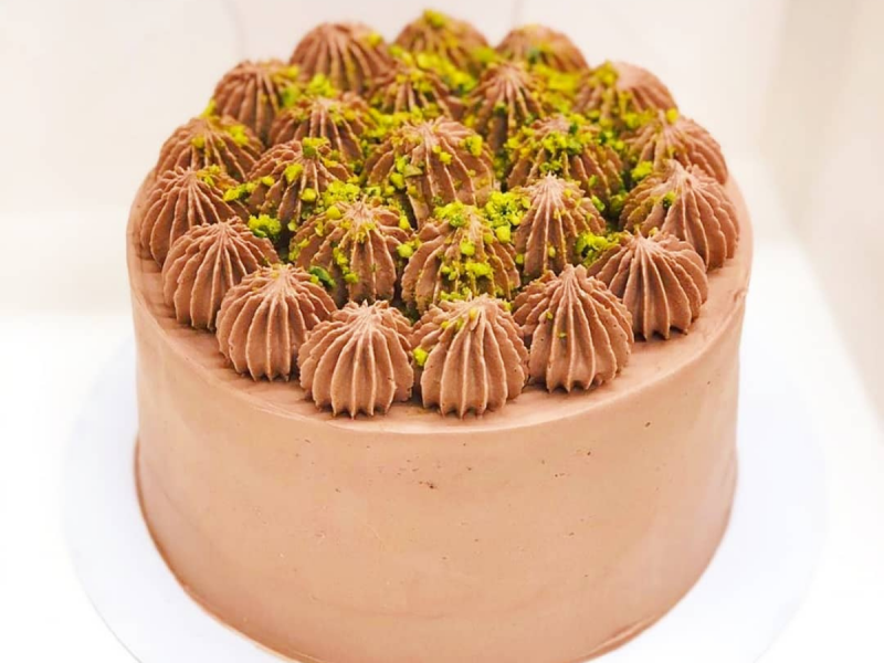 2.Jasny biszkopt, krem pistacja, konfitura z czarnej porzeczki