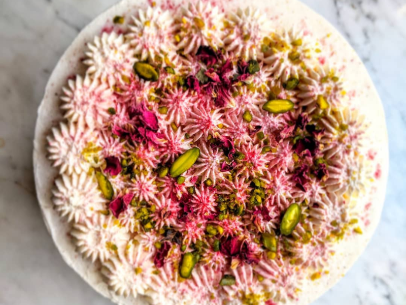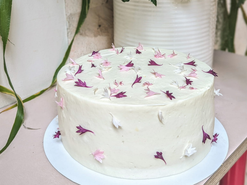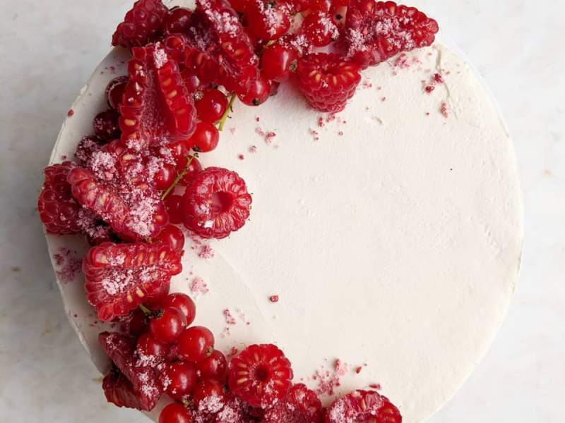 4.Jasny biszkopt,krem Malinowy,Żel liczi, świeża malina