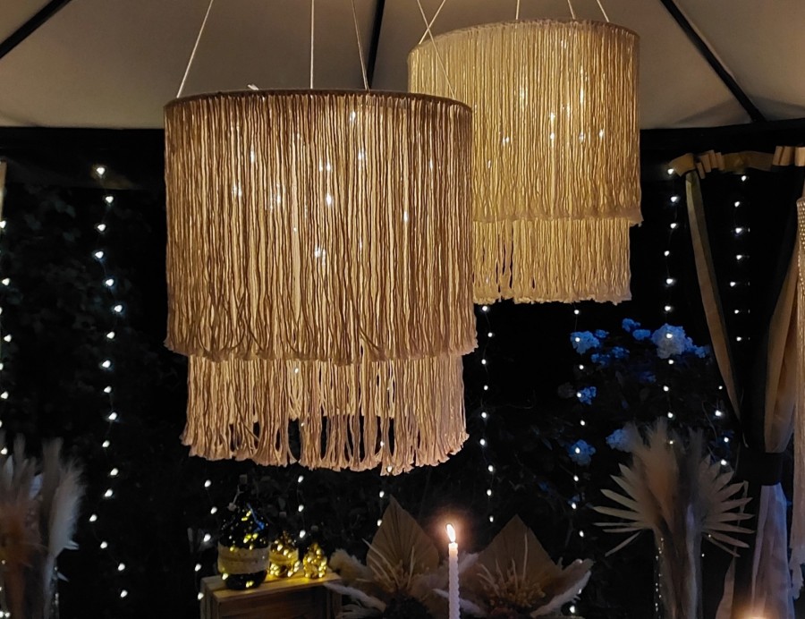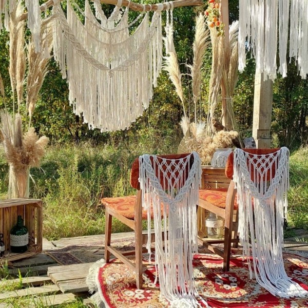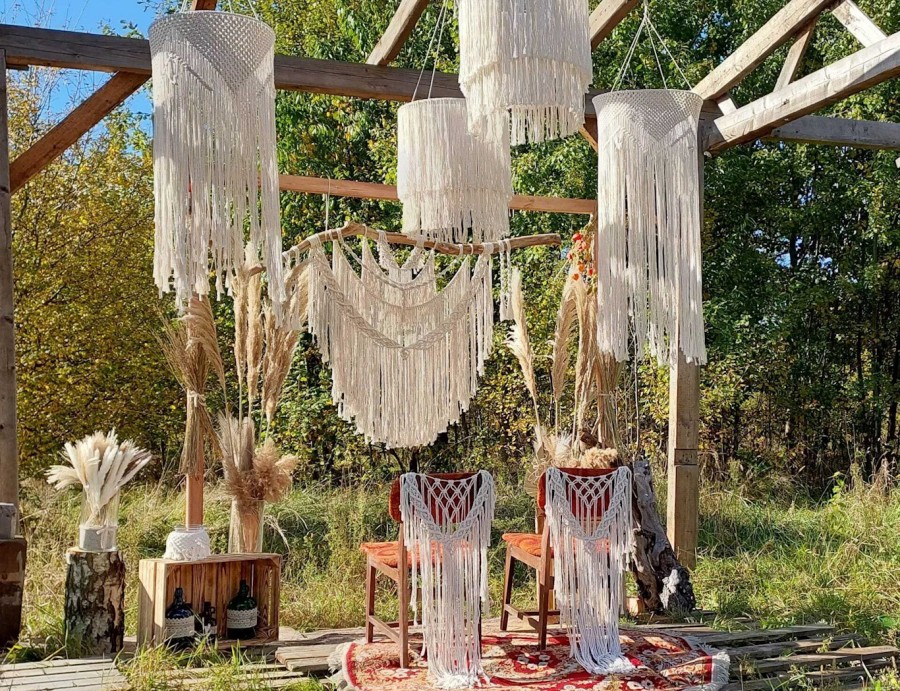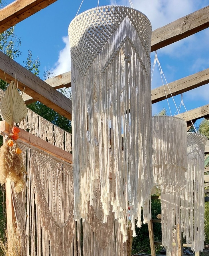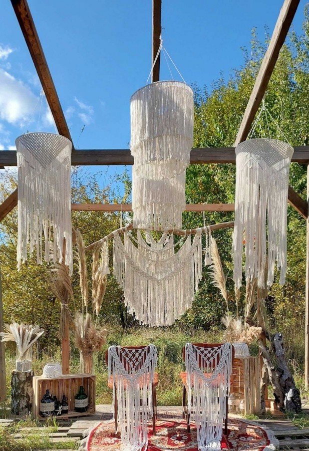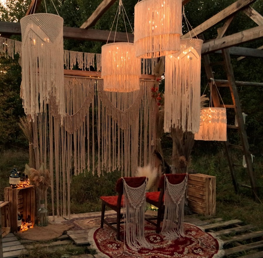 Oferujemy do sprzedaży i wynajmu rękodzieło wykonywane techniką makramy, wykorzystywane do dekoracji wnętrz. Ręcznie wyplatane makramy, abażury oraz kwietniki z bawełnianego sznurka z wykorzystaniem naturalnego drewna dodają ciepła i wyjątkowego klimatu każdej aranżacji. Oferujemy wyroby w szerokiej gamie kolorystycznej aby pasowały do każdego stylu pomieszczeń. W ofercie posiadamy również przedmioty użytkowe takie jak: torebki, kosmetyczki, serwetki, podkładki i organizery, a także dekoracje świąteczne i okolicznościowe. Posiadamy do wynajęcia szeroką gamę dekoracji weselnych w stylu boho, między innymi: ścianki dekoracyjne, lampiony, latarnie, świeczniki, dekoracje krzeseł, girlandy, lampy wiszące, podtalerze, podświetlane galony.