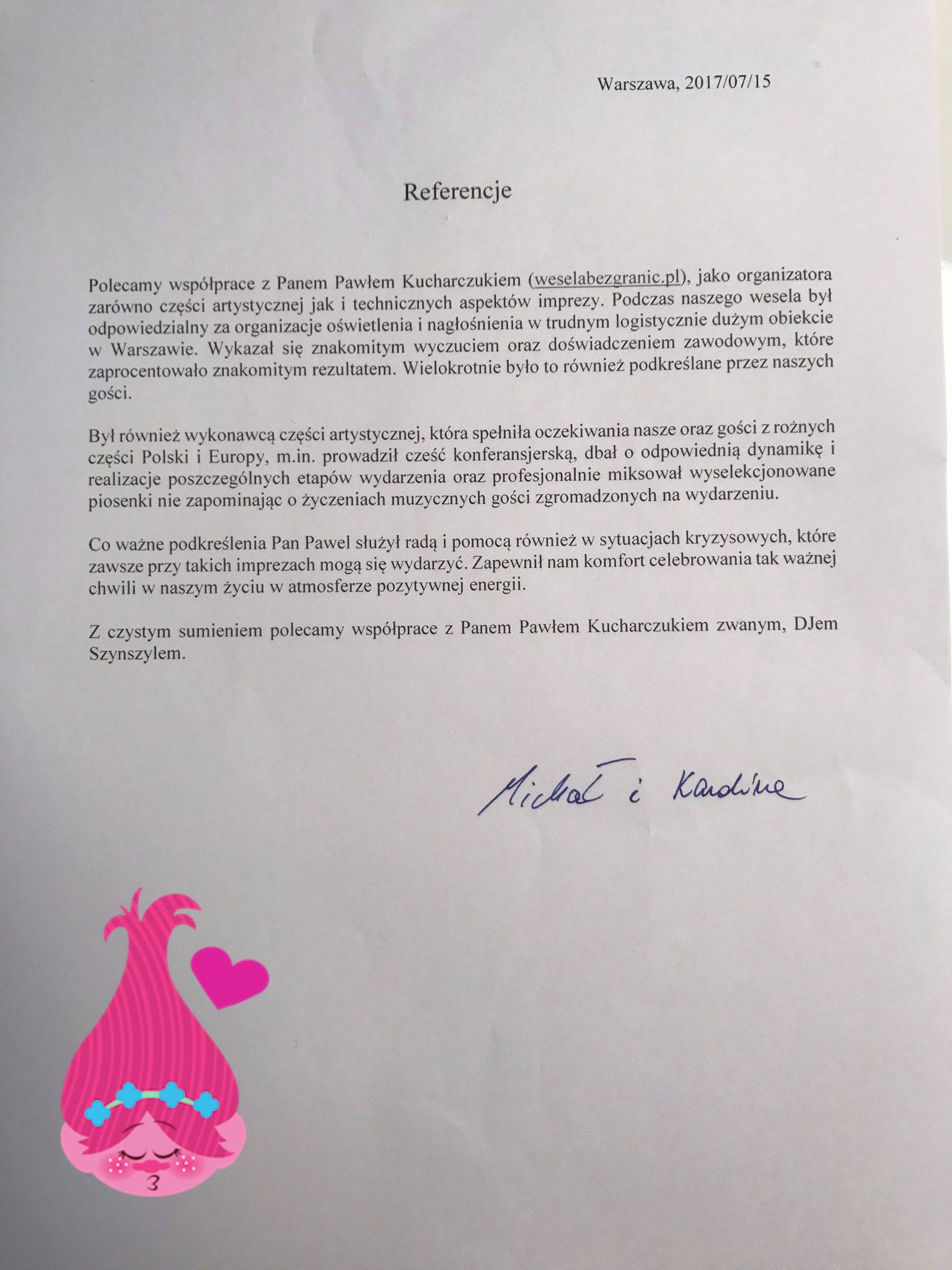 Bez względu na szerokość geograficzną oraz gusta, tworzymy wymarzone przyjęcie weselne. Mamy referencje i doświadczenie w obsłudze przyjęć weselnych z parami z różnych kultur np. Polska i Peru, Polska i Hiszpania, Polska i Brazylia, Polska i Liban, Polska i Tajwan, Polska i Portugalia (obsługa w Lizbonie), Polska i Algieria oraz liczne pary polskie, które chciały mieć przyjęcie weselne inne, które chciały połączyć klimat międzynarodowy z polskim. Z parami młodymi na długo zostajemy w bardzo pozytywnych relacjach. Kochamy to co robimy!