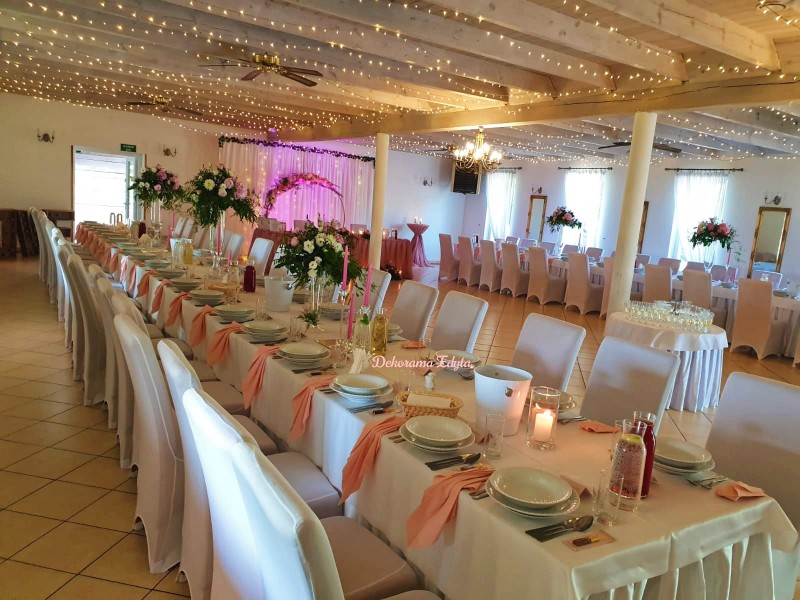 Dysponujemy salą weselną, która pomieści do 130 osób, małą salą na kameralne przyjęcia do 30 osób. Sala rustykalna- stodoła dla przyjęć do 50 osób. Gwarantujemy nocleg dla 50 osób z możliwością dostawki.