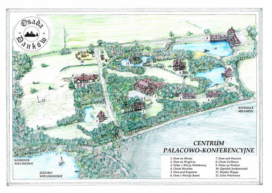 Do dyspozycji Państwa mamy 5 stylowych domów, Pałac z Wieżą Widokową, Pałac "na Wodzie" , Chatę weselną i Chate grillową, wszystko w otoczeniu lasów, łąk i mazurskiej przyrody.