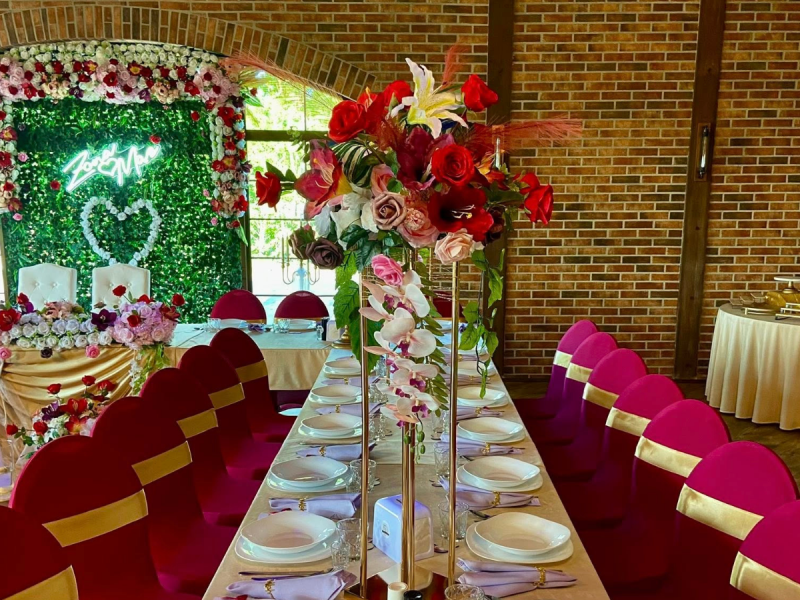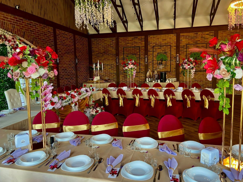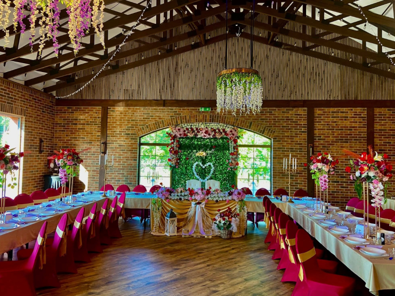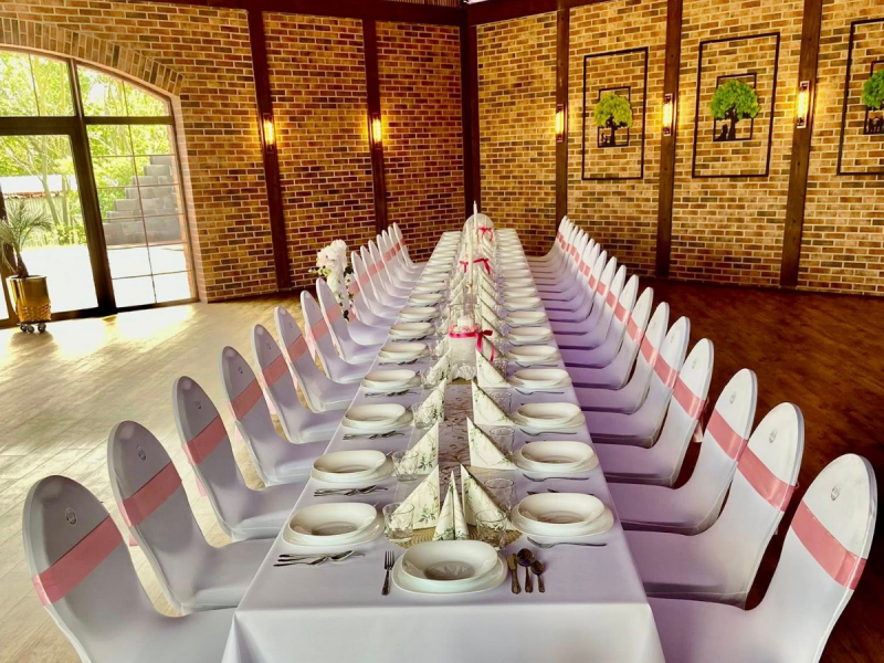 Zbudowaliśmy Salę bankietową w oparciu o tradycyjne materiały, drewno i ceramikę. Wysokość sali jest naszym głównym atutem. Sufit katedralny został wsparty na wiązarach, które tworzą konstrukcję pod dowolny wymarzony przez was wystrój waszej uroczystości. W związku z tym jesteśmy w stanie uczynić dla was dowolną oprawę scenograficzną w stylu tradycyjnym czyli boho lub każdym jakiego sobie wymarzycie. Wysokość wnętrza sali w szczycie to 750 cm.