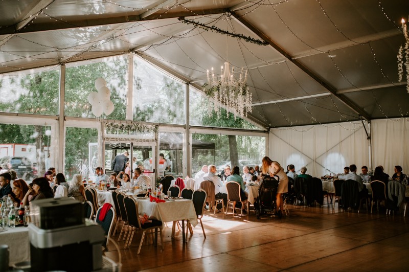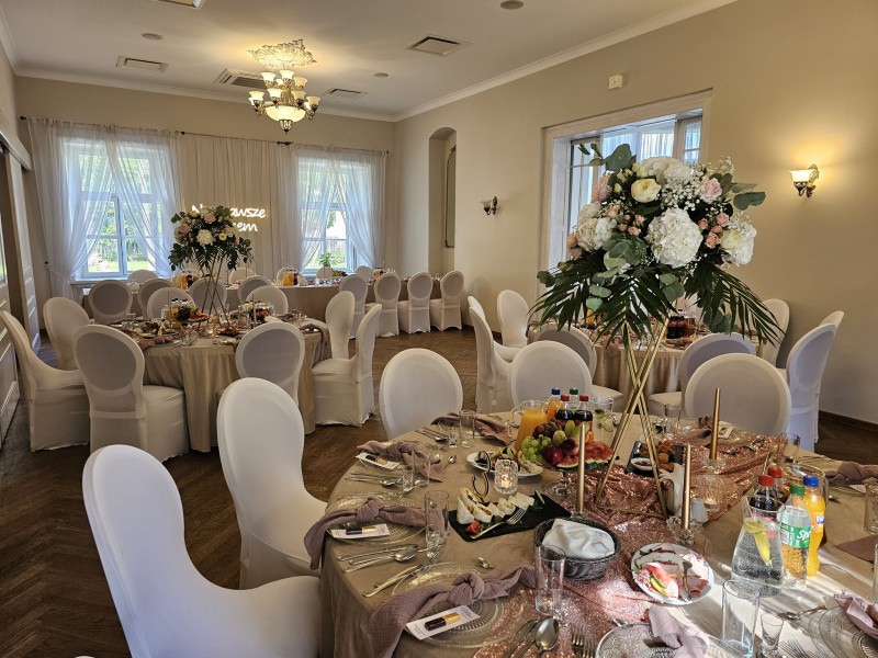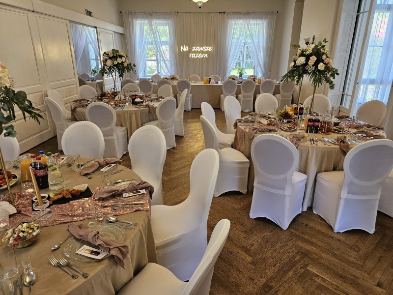 W lokalu jesteśmy w stanie przyjąć 110 gości, natomiast w hali bankietowej znajdującej się w zabytkowym parku nawet 500 gości. Ponadto, hala bankietowa wraz z galą wieczorową może zostać rozstawiona w dowolnie wskazanym przez Państwa miejscu – szczegóły do ustalenia. Przyjęcie weselne możemy zorganizować zarówno przy stołach prostokątnych w dowolnym układzie, jak i stołach okrągłych.