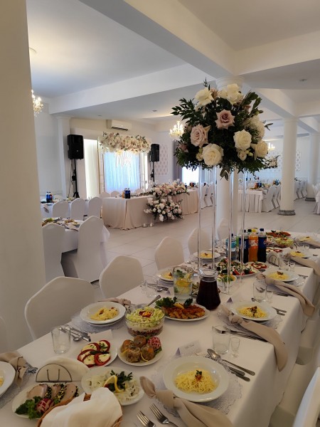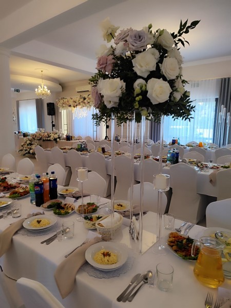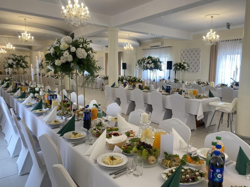 Do Państwa dyspozycji oddajemy klimatyzowaną dużą salę Krysztalową do 270 osób z salą jadalną w kolorze złotym, którą zdobią żyrandole kryształowe, oraz taneczną w barwach srebra z sceną dla orkiestry weselnej,
