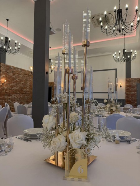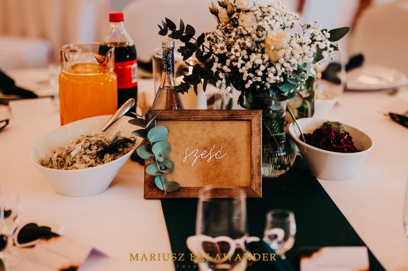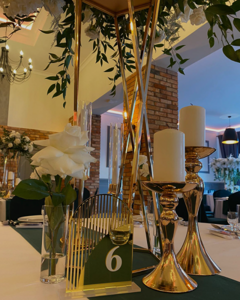 Jako podstawową dekorację proponujemy 4 kolory pokrowców na krzesła (białe, bordowe, ciemna zieleń butelkowa i brązowe), bankietówki i bieżniki w tych samych kolorach. Do dyspozycji Gości mamy również wysokie wazony martinówki i pilsnery. Dania serwowane są na białej, porcelanowej zastawie.