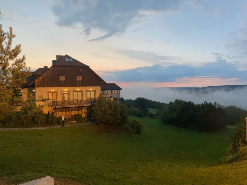 Wystrój zewnętrzny budynku i jego otoczenia stanowią rzeźby drewniane, inspirowane sztuką ludową, co tworzy niezapomniany klimat.