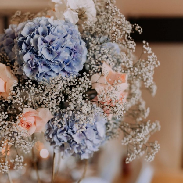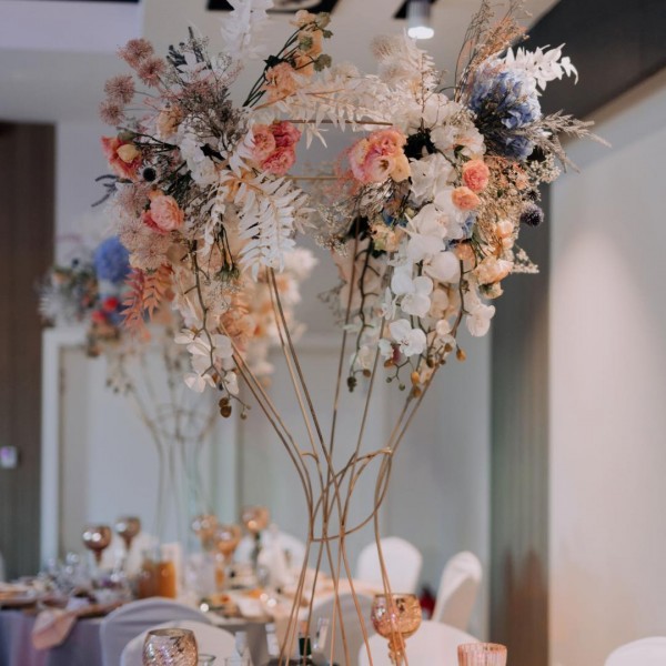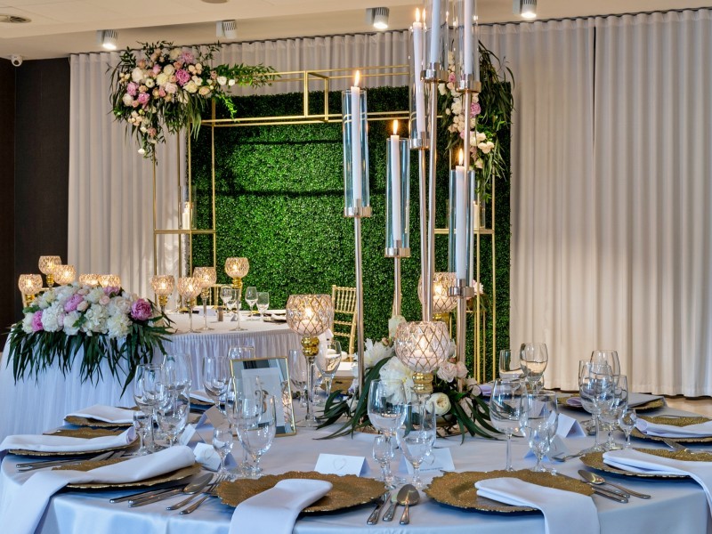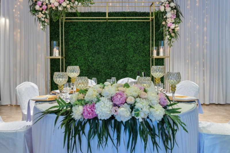 • Ścianka kwiatowa dekoracji za stołem Państwa Młodych