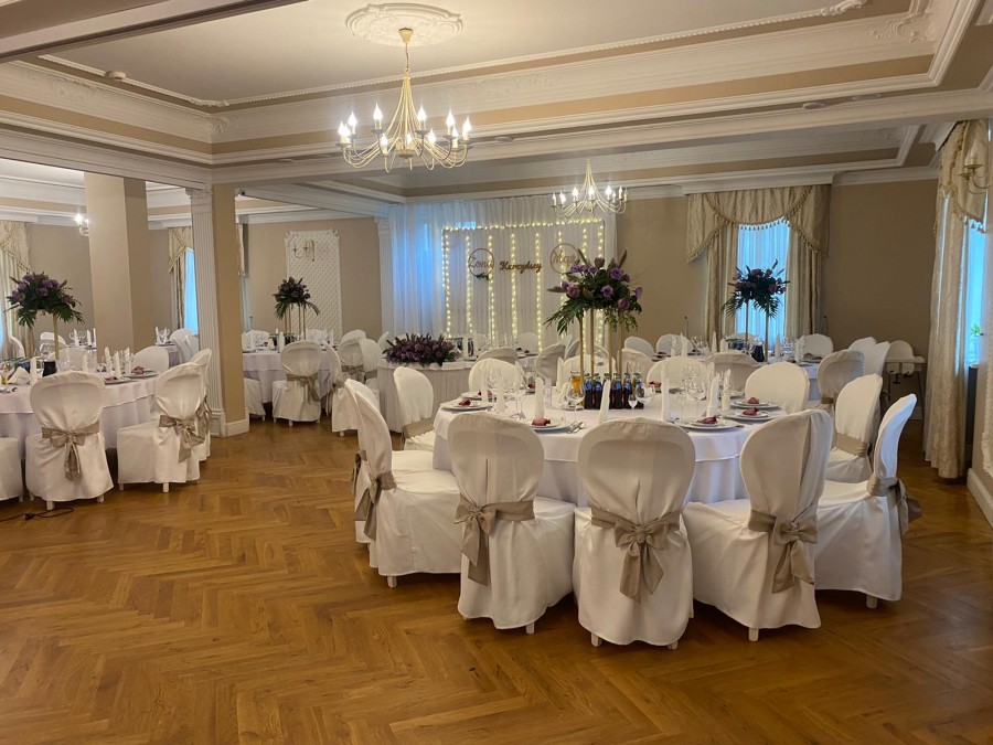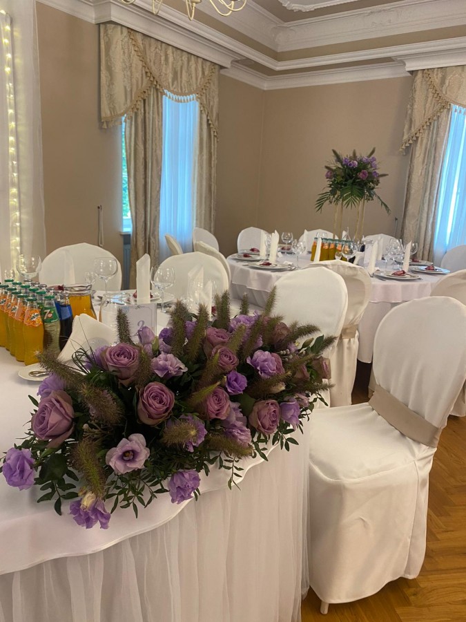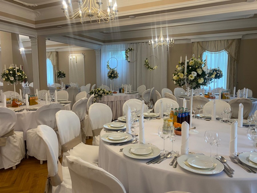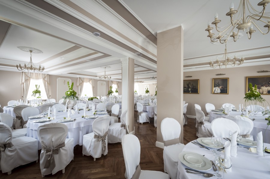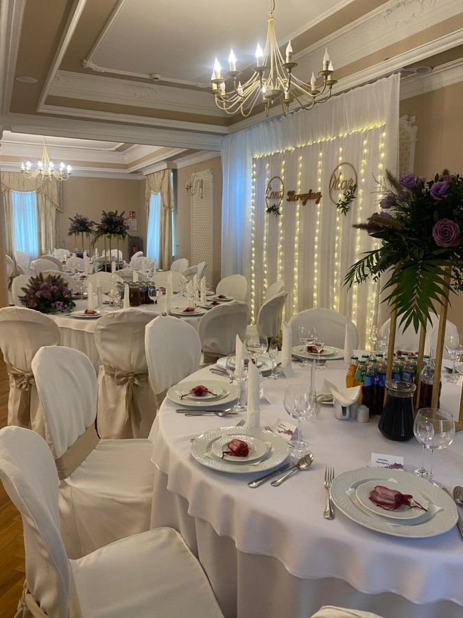 Sala Pałacowa, która znajduję się na parterze dworku zmieści 80 - ciu gości, klimat przyjęcia weselnego w zabytkowym obiekcie podkreślą zdobienia i wystrój nawiązujący do wnętrz pałacowych.