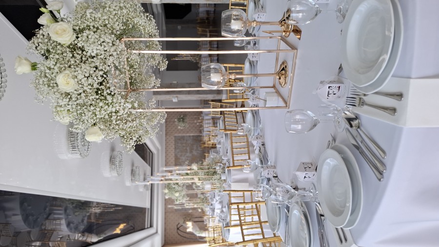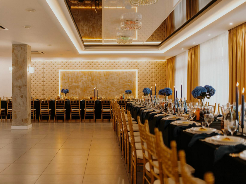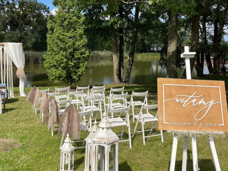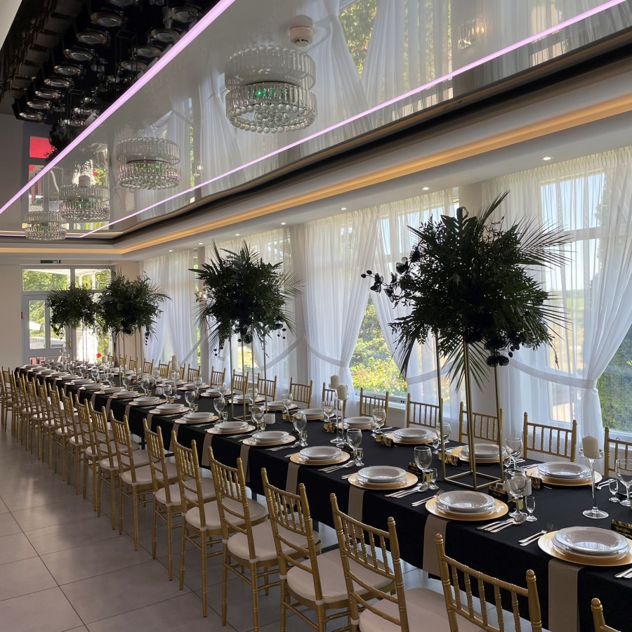 Sala weselna pomieści maksymalnie 110 osób. To wnętrze, w którym każdy rodzaj dekoracji będzie się idealnie wpasowywał. Panuje tam szyk i elegancja. Do dyspozycji mamy stoły okrągłe jak i prostokątne, a krzesła do wyboru w kolorze złotym lub srebrnym. Kolor lamp Led można dopasować to aranżacji sali. Dodatkowym atutem zdecydowanie jest taras widokowy, oraz ogród zaraz przy stawie.