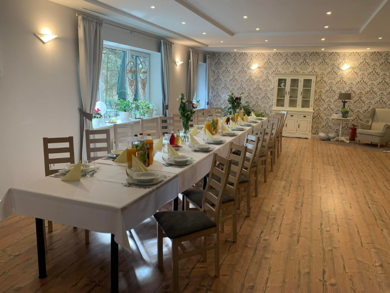 Sala Kominkowa jest doskonałym wyborem na przyjęcia komunijne, chrzciny czy innego rodzaju jubileusze. W tej sali może bawić się do czterdziestu osób, a jej dodatkowym atutem jest bezpośrednie wyjście na taras z widokiem na las.
