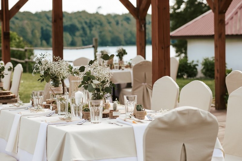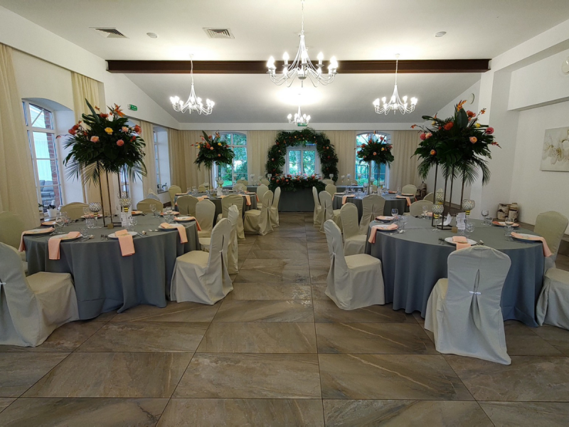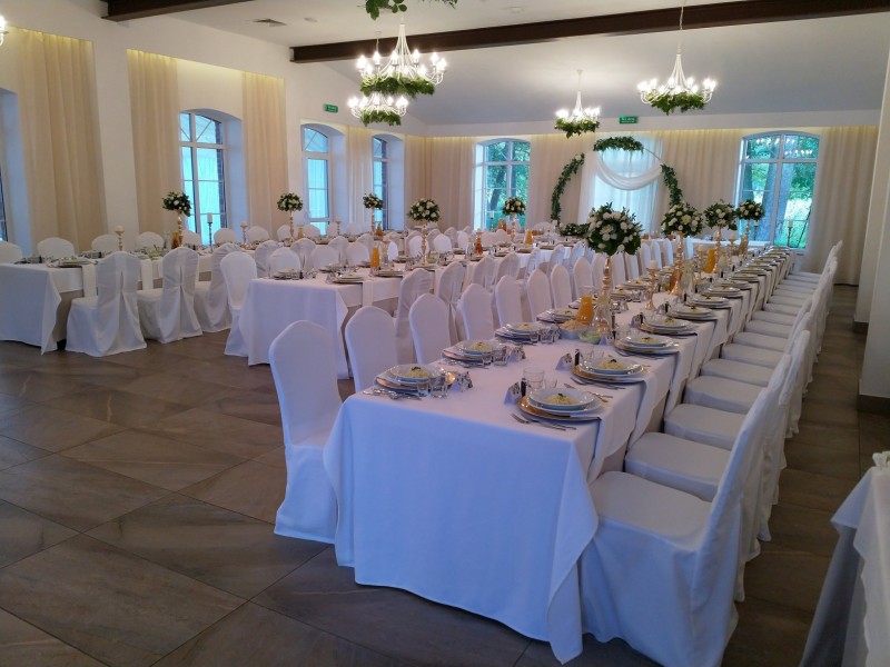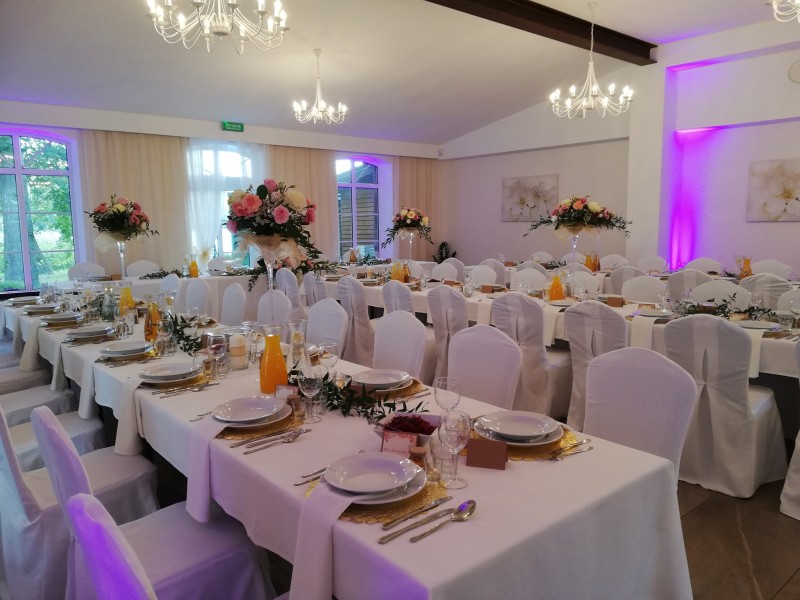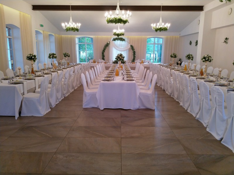 Do Państwa dyspozycji oferujemy elegancką salę balową, oraz dodatkową powierzchnię w namiocie z widokiem na jezioro. Do dyspozycji mamy różne warianty obrusów i pokrowców na krzesła, tak aby każdy mógł stworzyć swój idealny wystrój Sali na ten wyjątkowy dzień. Sala weselna wyposażona jest w profesjonalny sprzęt nagłaśniający oraz oświetleniowy, co zapewni odpowiednią atmosferę i udaną zabawę. Oferujemy również przygotowanie niecodziennego przyjęcia w malowniczym otoczeniu oraz komfortowe noclegi. Zaproponujemy pyszne, przygotowane na miejscu jedzenie, do wyboru w różnych wariantach, które zadowoli nawet wyszukane podniebienia Gości oraz na specjalnie życzenie wyselekcjonowany dla Państwa alkohol.