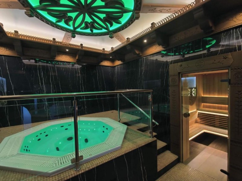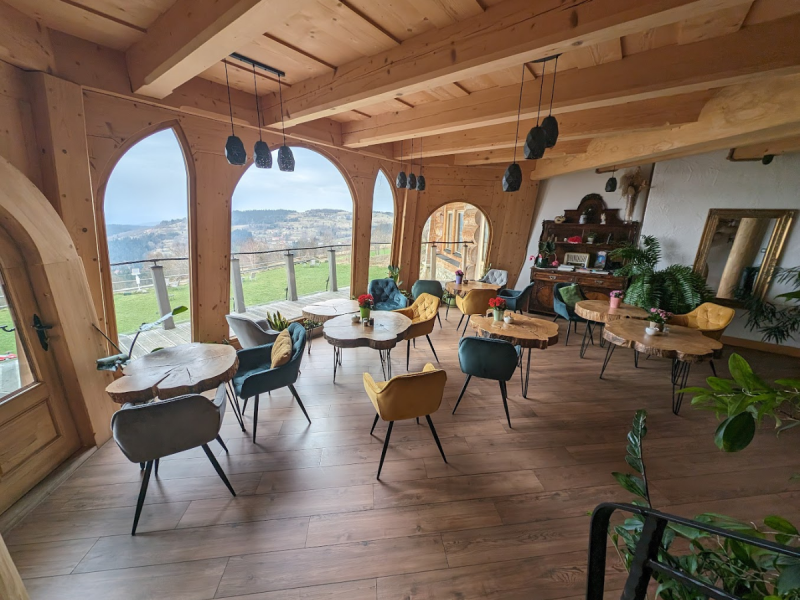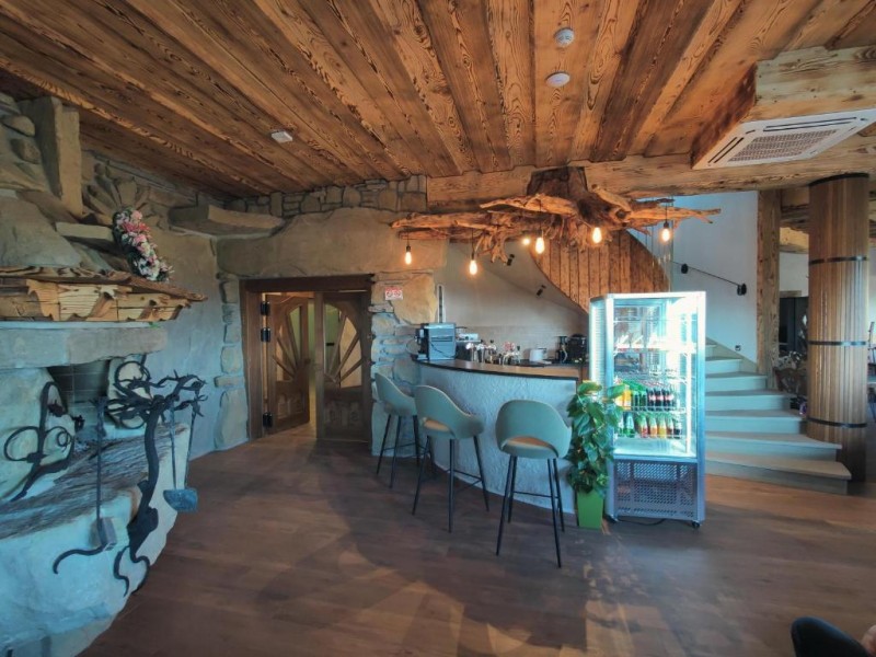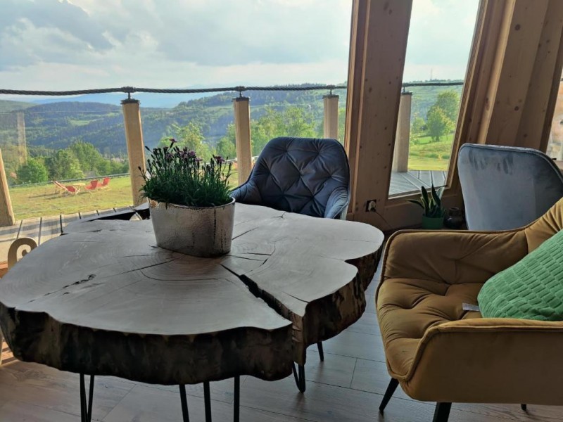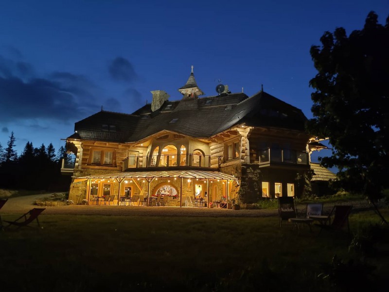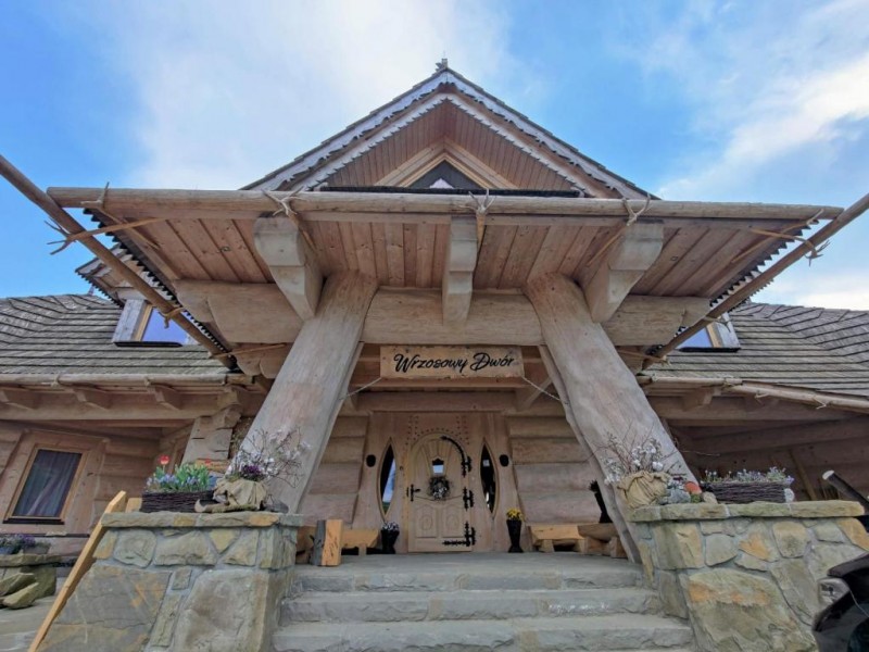Dwór w unikalnym stylu z drewnianych bali posadowiony na kamiennych murach przykryty krakowskim dachem z gontu. Regionalne akcenty wykończenia drewna oraz aranżacja przestrzeni z wykorzystaniem kamienia zapewniają harmonię z otaczającą przyrodą.