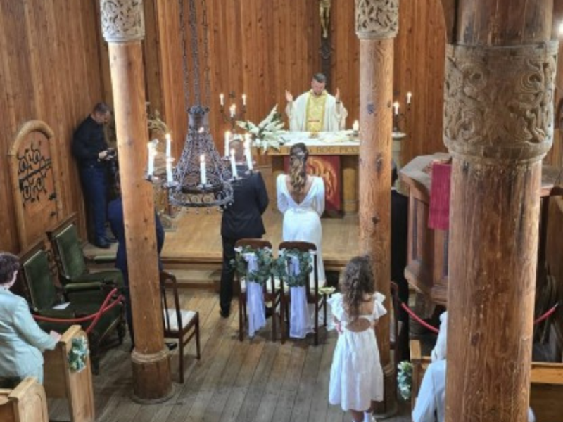 Jesteśmy z Poznania, ślub odbył się w Karpaczu. Z racji naszej miłości do gór ora zamiłowania męża do kultury norweskiej ślub zorganizowałam w Świątyni Wang...