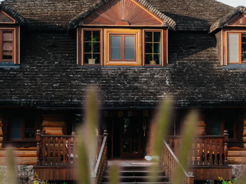 Drewniany dom z bala o łącznej powierzchni 400 m.kw. Posiada dużą część wspólną, która sprzyja spędzaniu czasu razem. Od wejścia wita przestronny hol z kominkiem i antresolą oraz duży taras wychodzący na piękny ogród. Na parterze znajduje się także kuchnia, przytulny salon i jadalnia. Natomiast na górze oprócz pokoi, znajdziesz też miejsce wypoczynku i biblioteczkę.