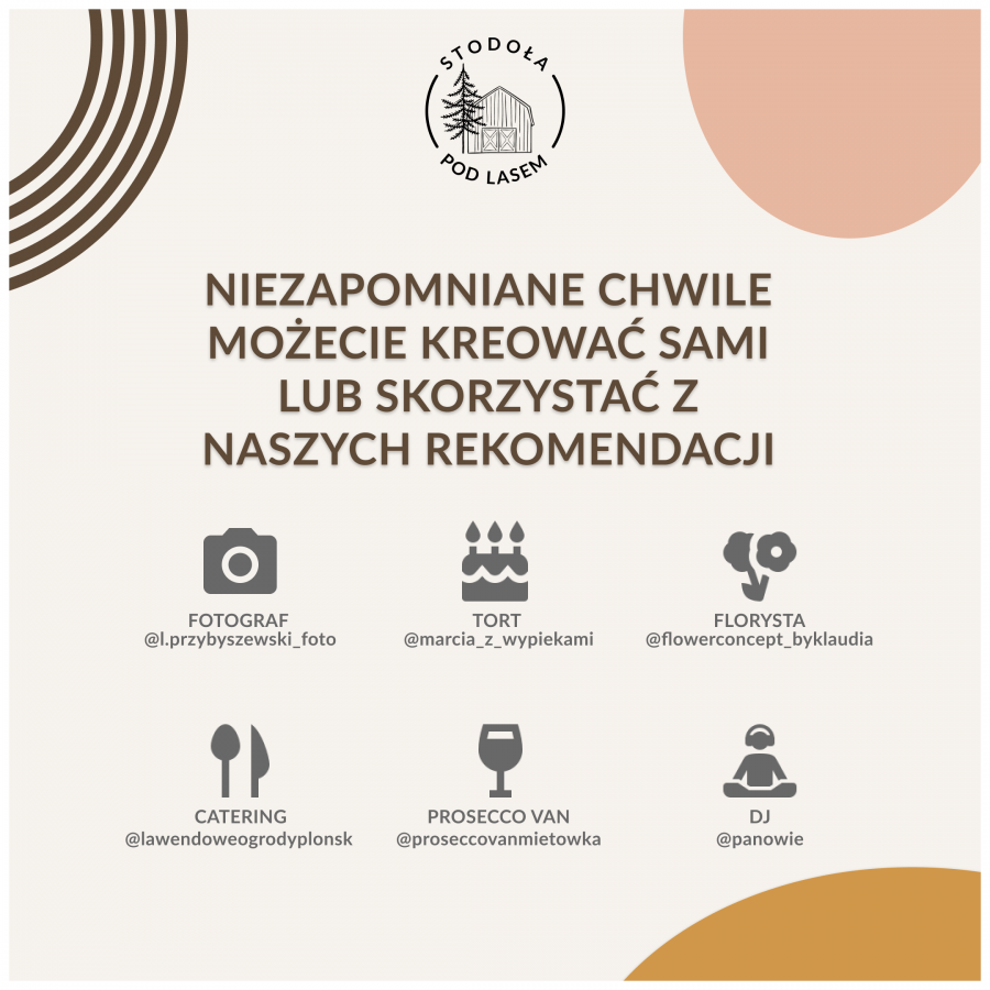 Tak, w ofercie rekomendujemy firmy do współpracy, którzy znają nasze miejsce i uczestniczyli w naszych imprezach. Jednak dobór usługodawców leży po Państwa stronie i jest zupełnie dowolny.