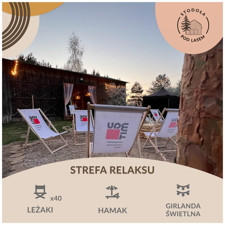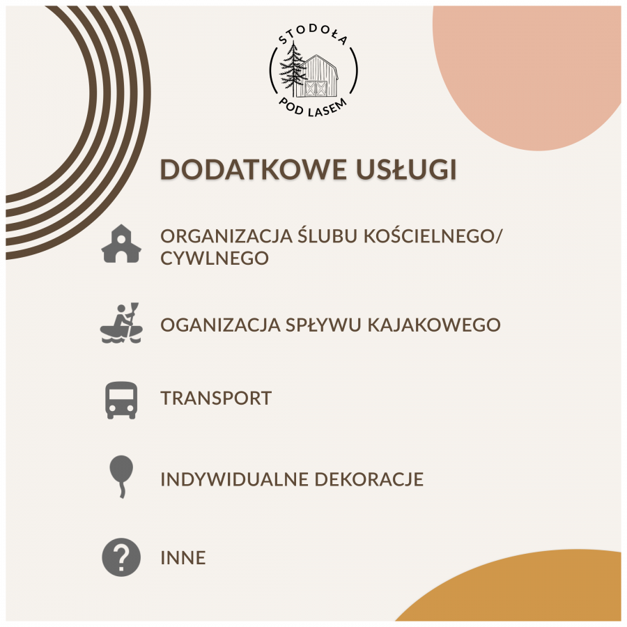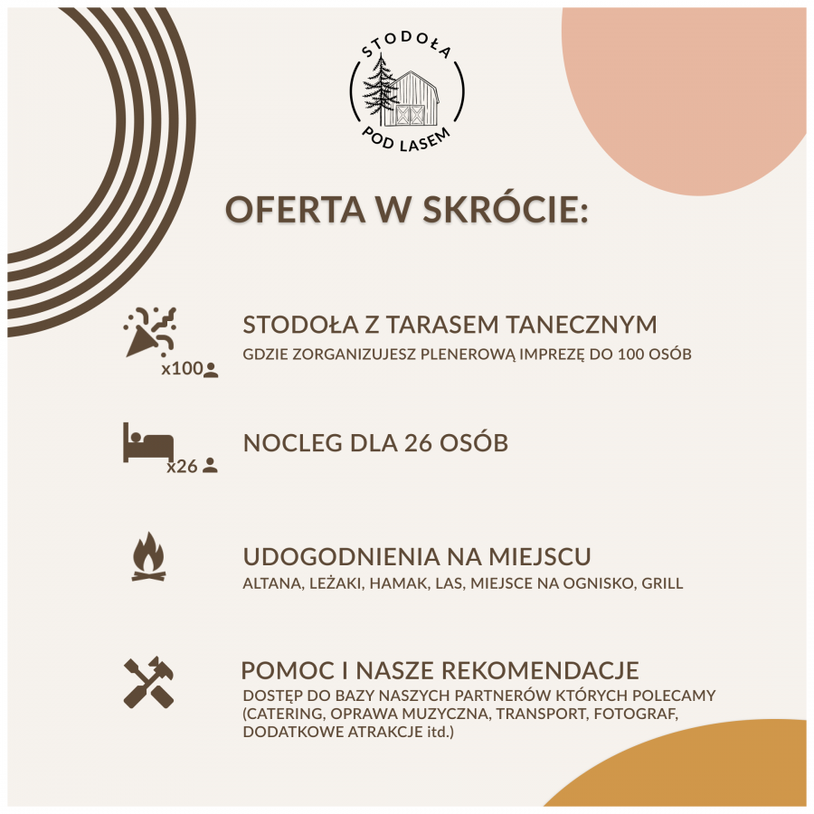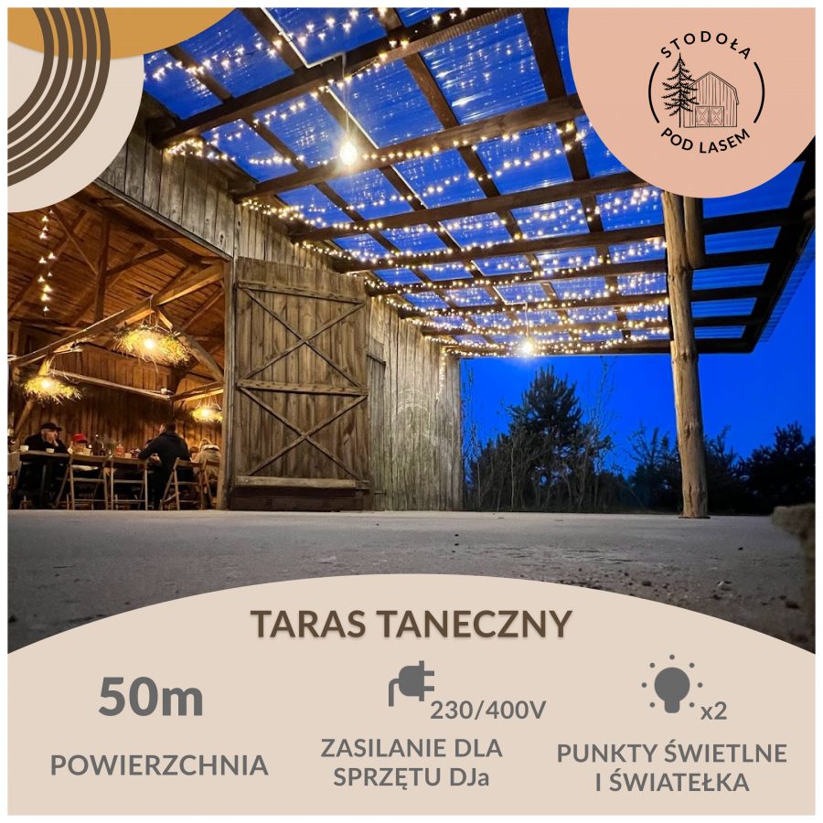 Cena wynajmu obejmuje wynajęcie stodoły z zadaszonym parkietem do tańca, na wyposażeniu posiadamy stoły i krzesła. Przed stodołą posiadamy strefę relaksu z leżakami oraz hamak. Dwie łazienki z trzema prysznicami i 3 toaletami. Zaplecze dla Kateringu z dostępem do prądu, lodówką i zamrażalką.