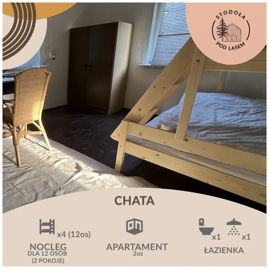 Posiadamy 26 miejsc noclegowych w tym 2 miejsca w apartamencie dla młodej pary, 14 noclegów w pokojach po 6 osób, oraz 12 osób w jednym pokoju – łóżka piętrowe, każde oddzielone od siebie zasłonkami, tak aby każdy czuł się komfortowo.