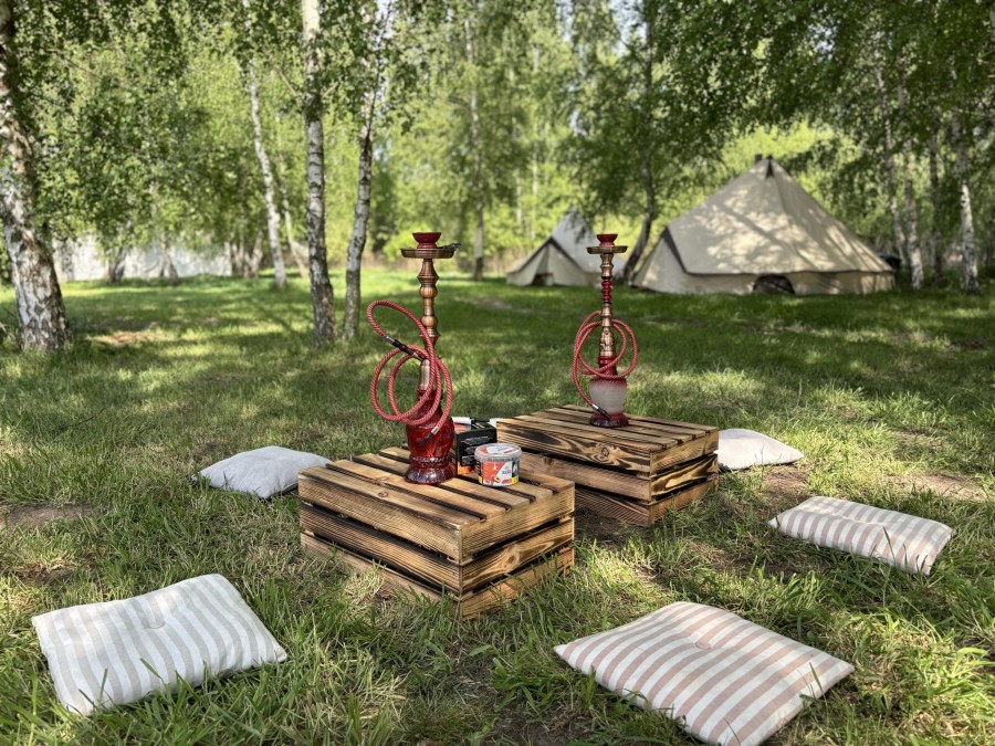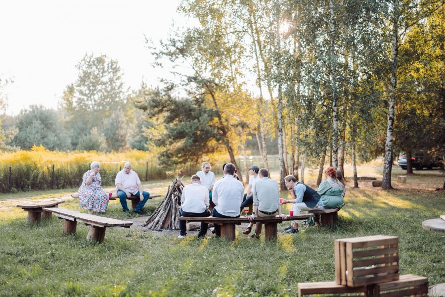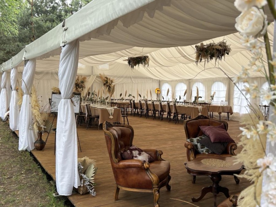 Hali Namiotowej Luxury Tent (150 m2) z pełnym wyposażeniem w stoliki, krzesełka, obrusy, zastawę, materiałowe woale przysufitowe i boczne, drewniany podest, oświetlenie, zaplecze cateringowe i sanitarne. Hala ma wiele możliwości aranżacyjnych dla gości do 80 osób. Dekoracje, catering, obsługa jest kosztem dodatkowym. Altana kryta strzechą w formie relaksacyjno-biesiadnej wraz z podestem i laskiem brzozowym, hamaki, leżaki, sprawdza się na przyjęcia w ciepłe dni do 20 osób. Stodoła z oranżerią do 150 osób - obiekt całoroczny, klimatyzowany, ogrzewany, z przeszkleniem na piękny ogród ( nowy obiekt z planowaną datą oddania do użytku na kwiecień 2026 r.). Organizujemy: