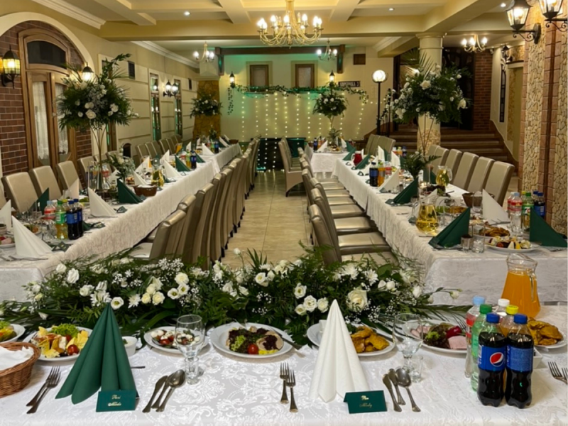 Oferujemy kompleksowe usługi w zakresie organizacji przyjęcia weselnego. Dysponujemy dwoma pięknymi salami bankietowymi (Lwowska i Kolumnowa), komfortowymi pokojami w trzygwiazdkowym standardzie oraz luksusowym pokojem na noc poślubną dla Pary Młodej.