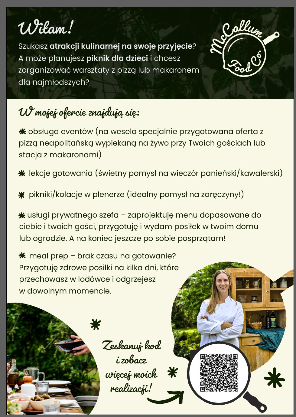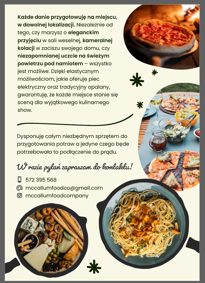 Potrawy przygotowuję na miejscu w wybranej przez Ciebie lokalizacji. Dzięki użyciu pieca zarówno elektrycznego jak i opalanego, uczta z powodzeniem może odbyć się w sali weselnej, u Ciebie w domu jak i na zewnątrz, pod namiotem.