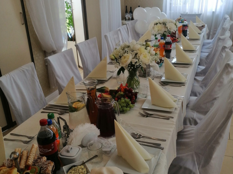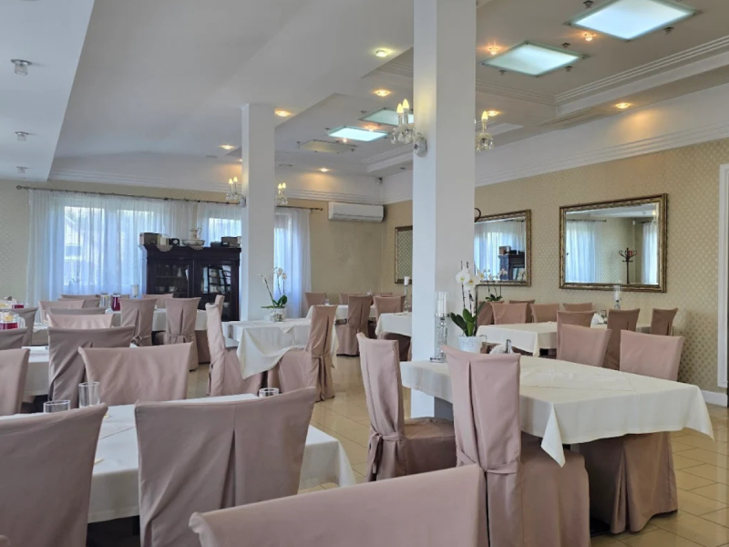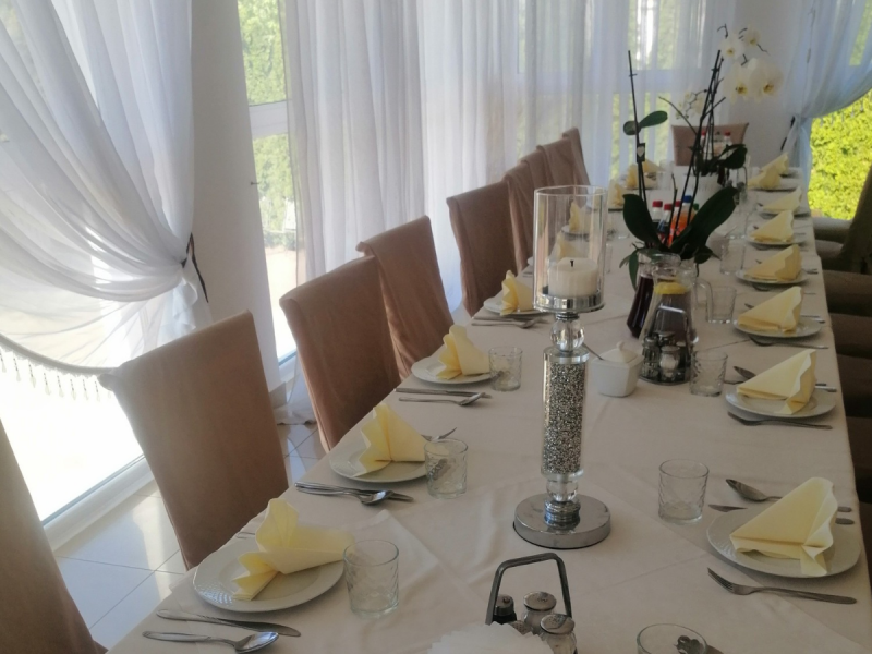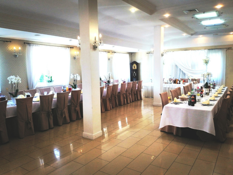 Sala weselna: Przestronna, klimatyzowana sala z eleganckim wystrojem pomieści komfortowo dużą liczbę gości. Stylowe wnętrza można dopasować do indywidualnej koncepcji dekoracyjnej Pary Młodej.