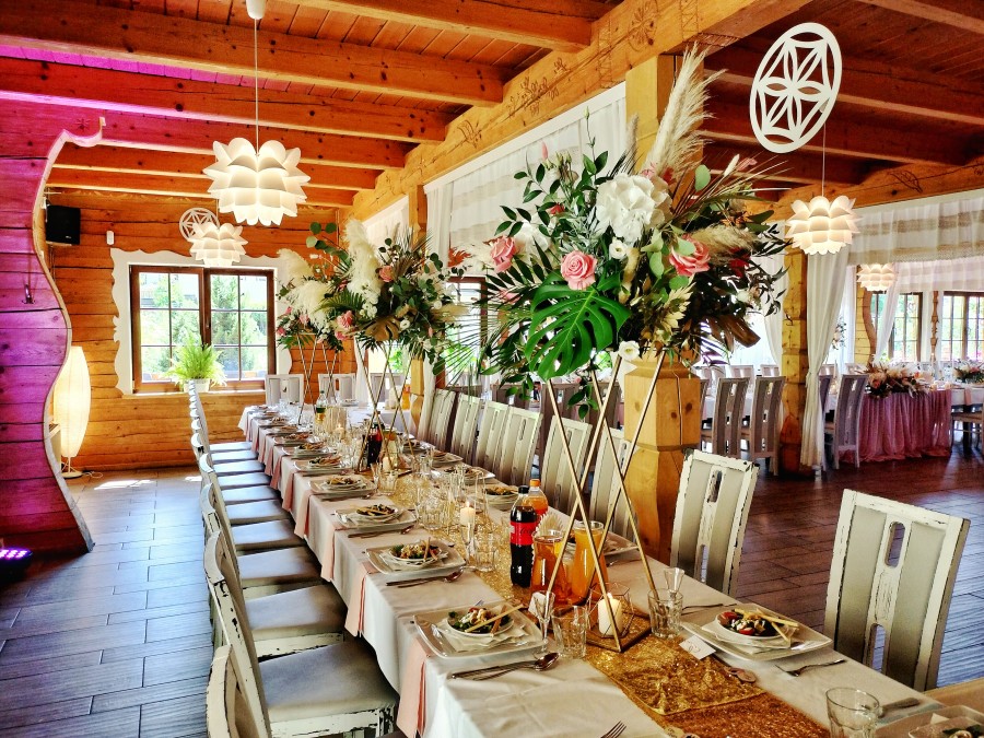 * gdy rozważasz uroczystość na ponad 60 osób możesz wynająć naszą restaurację na wyłączność. Wówczas w tym dniu w określonych godzinach otwieramy się jedynie dla Ciebie i nie przyjmujemy innych Gości w naszym wnętrzu. Taka formuła pozwala na zorganizowanie urodzin czy zabawy firmowej z obsługą muzyczną do późnych godzin. Uwaga! Wynajem na wyłączność jest możliwy wiosną: w miesiącach po 15 marca, kwiecień, maj i czerwiec (z wyłączeniem długich weekendów i świąt), a także jesienią: po 15 września, w październiku, listopadzie i do 20 grudnia. Marzy Ci się huczna impreza weselna w stylu folk, w całej ferii barw lub z morzem kwiatów? Oczywiście! A może tak typowe polskie wesele – biesiadę rodzinną trwającą do białego rana? Do Waszej dyspozycji oddajemy również komfortowe pokoje w Smakach Na Szlaku – 27 miejsc, w naszych domkach na skarpie do 24 miejsc (3 domki po maksymalnie 8 osób).