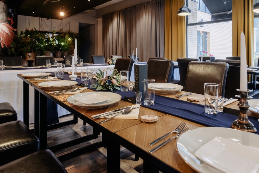 Dysponujemy dwiema przestrzeniami: sala restauracyjna dla 70 osób i sala bankietowa dla 300 osób.
