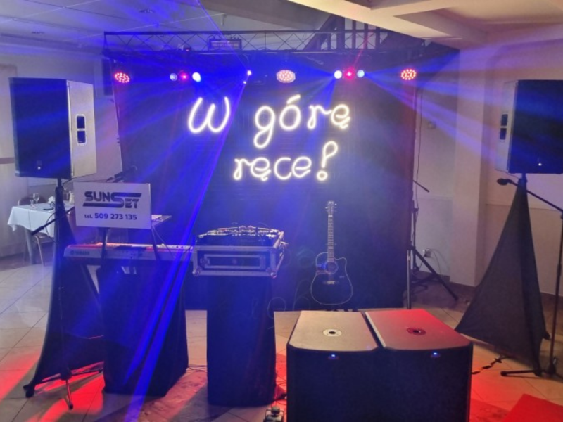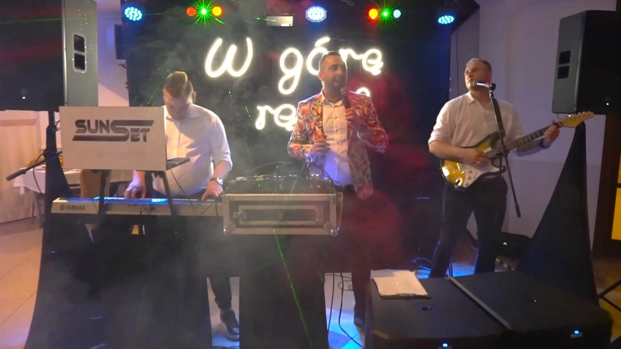 Zespół muzyczny SunSet + DJ Wodzirej to połączenie zalet klasycznego zespołu i Dj'a. Prowadzimy zarówno wesela katolickie jak i prawosławne. Zespół składa się z czterech osób, perkusja elektroniczna, gitara, akordeon i klawisze. Gramy muzykę polską rock, pop, disco - dance jak najbardziej zbliżoną do oryginałów, a także po białorusku czy ukraińsku. Na życzenie współpracujemy również z DJ mówiącym po Niemiecku. Większość zabawy prowadzi wodzirej - wspólne śpiewanie z podziałem na role, szybki kurs tańca, biesiada z akordeonem, familiada czy jaka to melodia? przy specjalnym stole z Guzikami jak w teleturnieju - to tylko niektóre z atrakcji, które przygotowaliśmy dla Państwa. Nasz DJ zagra wszystko to czego zespół nie jest w stanie zaśpiewać, m.in. repertuar obcojęzyczny, muzyka nowoczesna, elektroniczna, czy specjalne życzenia gości weselnych. Młodym Parom przygotowaliśmy nieco szaleństwa w naszym bloku muzyki nowoczesnej - rozdajemy wówczas gościom Ledowe pałeczki (ok. 150 szt.), Młodym wręczamy pistolet na CO2, zapraszamy ich na podwyższenie i odpalamy pokaz laserowy, DJ zadba o to abyśmy przez chwilę poczuli się jak na festiwalu z prawdziwego zdarzenia. Nasz akordeonista zadba o biesiadę, a wodzirej pomoże gościom śpiewać wszystkie znane szlagiery. Z dodatkowych atrakcji możemy Państwu zaoferować Ciężki Dym na pierwszy taniec lub moment pojawienia się tortu na sali. Posiadamy nowoczesne oświetlenie i nagłośnienie, napis Ledowy "W górę ręce!", który jest ustawiony centralnie za zespołem. Jesteśmy przygotowani na wesele każdej wielkości i w niemal każdych warunkach. Każdą uroczystość personalizujemy pod indywidualne wymagania Pary Młodej, dlatego na spotkaniu przed podpisaniem umowy wręczamy Państwu tzw. "Pytania do scenariusza". Na podstawie odpowiedzi będziemy mogli maksymalnie sprostać Waszym wymaganiom. Oprócz wesel zagramy niemal każdą imprezę - poprawiny, bankiety, andrzejki, bale karnawałowe, noc sylwestrowa, osiemnastki, połowinki, studniówki, koncerty plenerowe, w klubach itp.