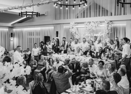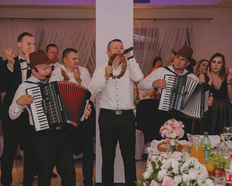 Wesela rozpoczynamy tradycyjnie – graniem u Pana Młodego i Pani Młodej w domu, przy akompaniamencie dwóch akordeonów oraz tamburynu. Następnie zabawa przenosi się do sali weselnej, gdzie zapewniamy pełną oprawę wydarzenia: uroczyste przywitanie Pary Młodej, wspólną biesiadę przy stołach z gośćmi, prowadzenie oczepin oraz nieprzerwaną zabawę aż do białego rana.
