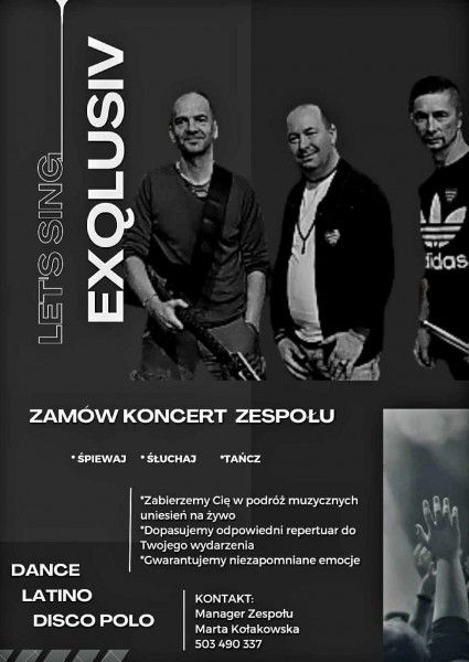 Kochani, gramy koncerty oraz festyny jako FORMACJA "EXQLUSIV". Działamy w branży Disco Polo Dance. Jesteśmy autorami takich utworów jak: "Do ostatniej piosenki", "Tańczy Mariola", "To jest miłość", "bo z tobą", "aktorka", "zwariowana miłość".
